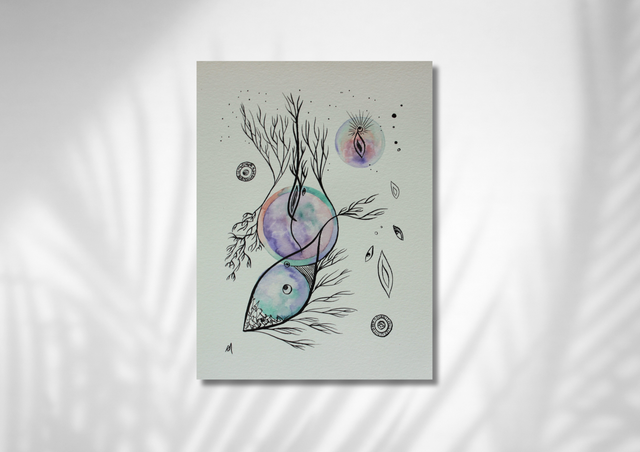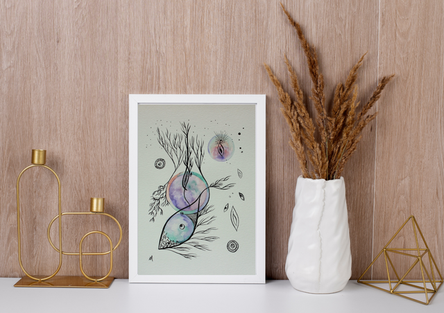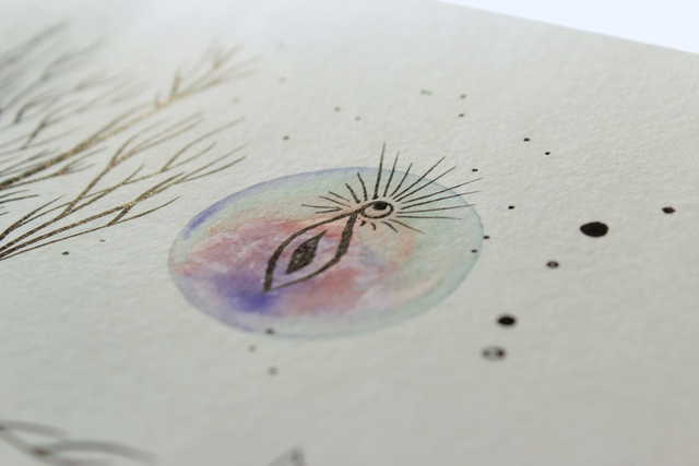 Cette aquarelle est composée pour être harmonieuse. L'encre viens souligner ces sphères colorées qui apportent une dimension plus spirituelle à l'esthétique. Un cadre avec un passe-partout de 35x28cm valorisera cette illustration. Ce format standard vous permettra de multiples possibilités d'agencement.