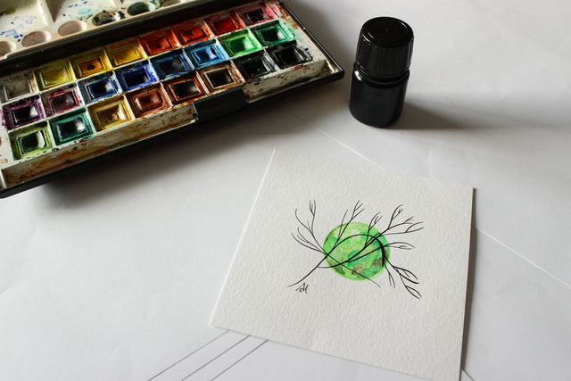 Le mélange encre et aquarelle apporte une complémentarité et de l'harmonie dans la composition.