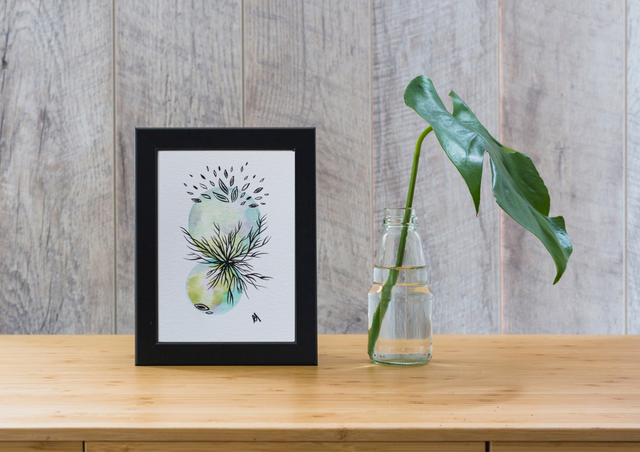 Réalisée intuitivement, elle résonnera avec vos émotions. L'encre vient souligner ces sphères colorées qui apportent une dimension plus spirituelle que décorative. Pour la valorisée, un cadre sous verre ou avec un passe-partout sont recommandés. Posée sur un bureau ou affichée en pêle-mêle elle vous apportera de l'harmonie dans votre espace. Offrez-vous un moment de contemplation et laissez place à l'imagination!