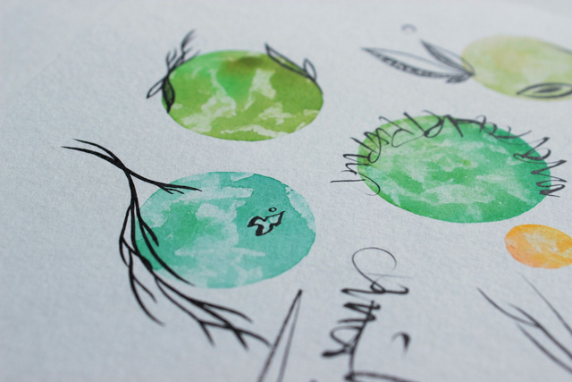 L'encre de Chine viens souligner ces sphères colorées qui apportent une dimension plus spirituelle à l'esthétique.