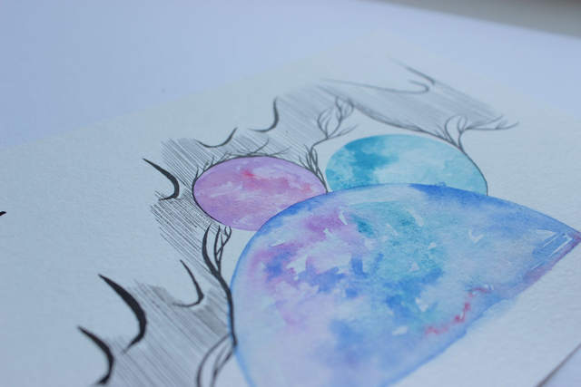 L'aquarelle et l'encre de Chine en complémentarité apportent de l'équilibre et du rythme dans la composition.